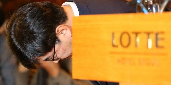 ▲ 롯데마트 김종인 대표가 18일 오전 서울 중구 롯데호텔에서 가습기 살균제 피해자 사과 및 보상 발표 기자회견을 하던 중 고개 숙여 사과하고 있다. <사진=연합뉴스>