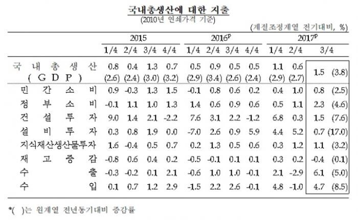 1일 한국은행이 발표한 '2017년 3분기 국민소득(잠정)에 따르면 3분기 실질 국내총생산(GDP)는 2분기보다 1.5% 증가했다. 이는 지난 2010년 2분기(1.7%) 이후 최고 수준이다.
