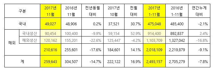 다만 11월까지 누적 국내판매는 47만5,048대로 지난해 같은 기간에 비해 2.1%로 소폭 감소했다.