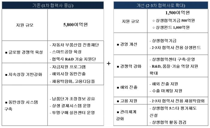 이는 300여개 1차 협력사와 5000여개 2·3차 협력사로 대상을 확대, 경영개선·경쟁력 강화·해외진출·고용지원 등 4대 분야 지원과 1차-2·3차 협력사간 상생협력 관리체계 강화가 골자다.