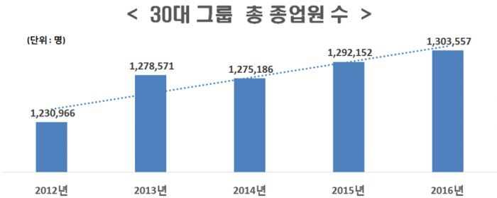 [토요경제=송현섭 기자] 자산순위 상위 30대 그룹 근로자수가 도·소매업을 중심으로 5년간 7만2591명 증가했다.