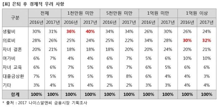 40대 이상 소비자들이 은퇴 후 경제적으로 가장 우려되는 사항에 대해 금융자산 1000만원 미만 보유 가구는 생활비(40%), 1억원 이상 보유 가구는 의료비(32%)에 대한 우려가 각각 높았다. 금융자산 1000만원 미만 보유 가구는 생활비에 대한 우려가 40%로 작년 조사(36%) 당시보다 4%포인트 증가했고 금융자산 1억원 이상 보유 가구는 의료비에 대한 우려가 32%로 같은 기간 2%포인트 늘어났다.