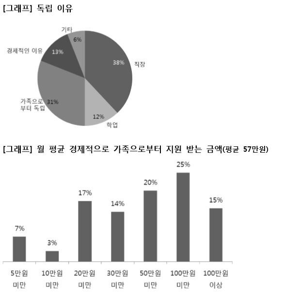 독립 이유로는 직장(38%), 가족으로부터 독립을 원해서(31%), 경제적인 이유(13%), 학업(12%) 등이었다. 미혼 1인 가구의 20%는 부모 및 가족으로부터 보증금 이외에도 월 평균 57만원의 경제적 지원을 받고 있는 것으로 나타났다.