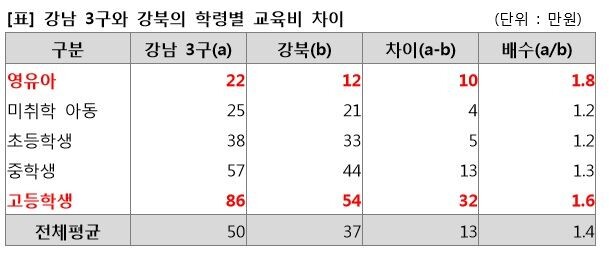 강남 3구(서초구, 강남구, 송파구)와 강북의 사교육비의 차이는 각각 50만원, 37만원으로 평균 13만원이나 차이났다. 강남 3구가 1.4배 높은 것이다. 학령별로 영유아 1.8배, 고등학생 1.6배의 차이를 보였다.
