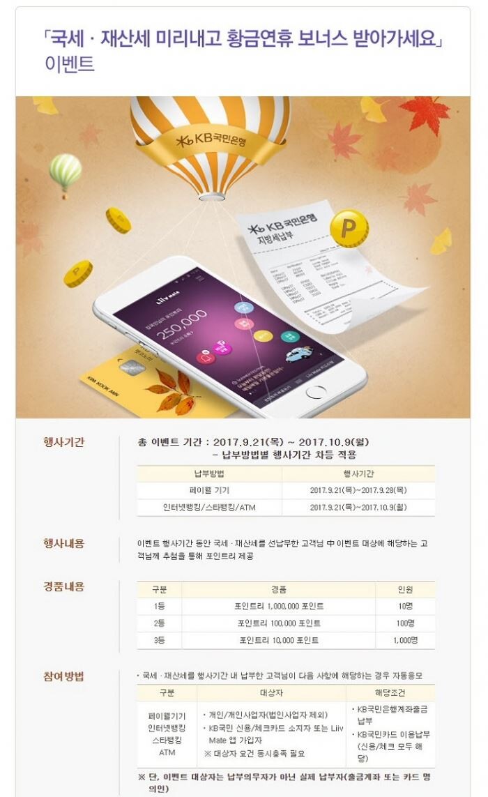이벤트 기간 동안 ▲인터넷뱅킹 ▲스타뱅킹 ▲페이웰기기 ▲ATM을 이용해 국세, 재산세를 납부하는 고객을 대상으로 추첨을 통해 푸짐한 경품을 증정하게 된다. 당첨자에게는 리브메이트로 KB국민카드 포인트리를 지급하며, 100만 포인트리 10명, 10만 포인트리 100명, 1만 포인트리 1000명 등 총 3000만원이 제공된다.