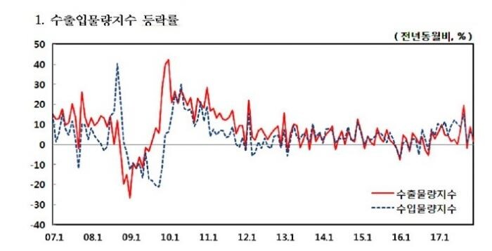 26일 한국은행의 '2017년 12월 무역지수 및 교역조건'에 따르면 작년 12월 수출물량지수가 147.90(2010=100)으로 전년동월대비 1.7% 상승했다.