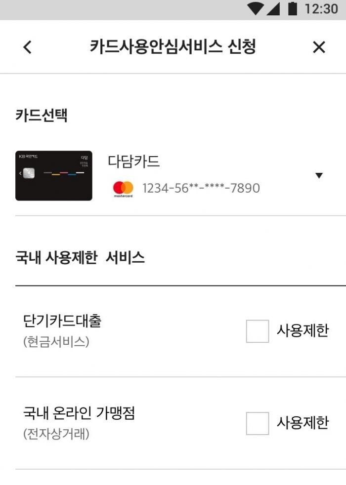 해외의 경우 오프라인(자동화기기 포함) 가맹점 및 온라인 가맹점 사용 여부를 선택할 수 있다. 카드 이용 기간도 고객이 보유한 카드의 유효기간 만료일까지 하루 단위로 설정할 수 있고, 이용 국가는 최대 6개국까지 지정 가능하다.
