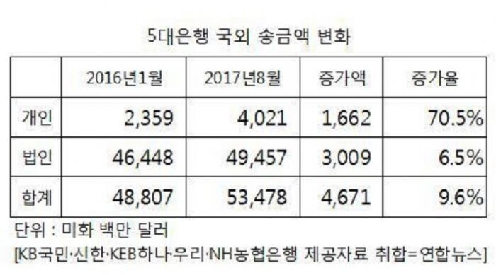 5대 은행의 법인 송금은 작년 1월 464억4800만달러에서 올해 8월 494억5700만달러로 약 6.5% 늘었다.