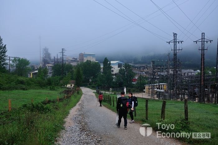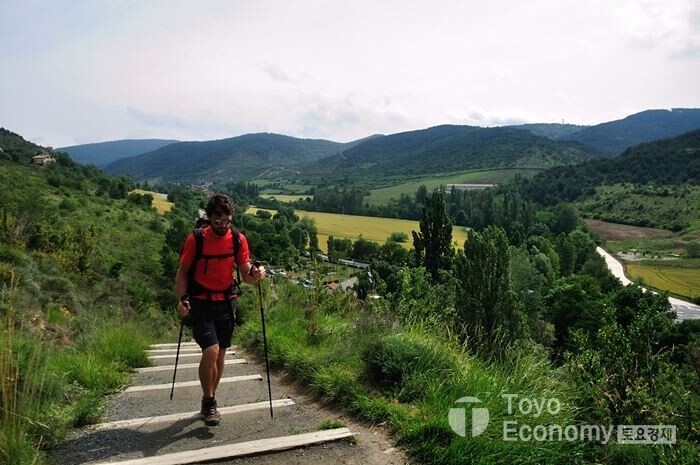 Zubiri로 들어왔던 다리를 다시 건너 오른쪽방향으로 틀어 걷기 시작했다. 처음부터 오르막길이 나타나니 일행들 표정이 굳어진다. 낭패본듯한 표정이다. 가는 길이 자잘하게 오르막과 내리막이 많다. 다행인것은 길이 넓고 경사가 심하지 않다는 것... 이제서야 피레네를 완전하게 벗어난 듯한 느낌이다. 어제처럼 숲이 가득한 길보다는 도시가 보이고, 공장지대가 보이는 현대화된 (?)길을 걷고 있으니까.. 게다가 대로와 같은 넓은 길이여서 딱트인 풍경을 보면서 걸을 수 있다. 하지만, 그늘이 별로 없다는 것이 아쉬울따름이다. 프랑스길의 진정한 모습에 들어선것이 아닐까 싶다.