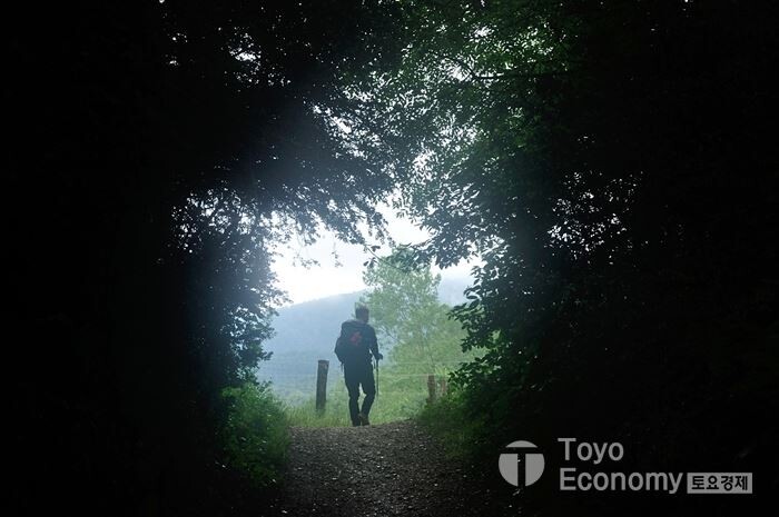 갈림길이 다시 합쳐지는 곳에서부터는 고개를 넘어가는 좁은 오솔길이였다. 배낭이 무거워도 오르기 어렵다고 생각했는데 다른 일행 한 명이 발이 아프다고 힘들어 하기 시작했다. 아마도 물집이 생기려는 모양이다. 안나푸르나를 다녀왔다고 하는 경력자인데도 배낭메고 홀로 걷는 순례길에는 힘든가 보다.