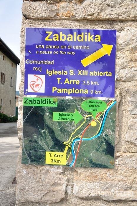 그저, 갈림길에서 헷갈리지 않도록 기다리면서 휴식을 취하는것이 전부이다. Zabaldika에 처음으로 갈림길을 만났다. 오른쪽으로 가면 오르막을 올라 성당을 거쳐가는 길이라면, 왼쪽으로 내려가면 강변따라 우회하는 길이다. 대부분의 순례자들은 여기서 머뭇거리며 어떻게 해야할지 고민에 빠진다. 나의 일행들은 고민할 여지 없이 편한 길로 가자고하여 왼쪽 방향으로 내려갔다. 밀알이 가득달려 있는 농경지 옆으로 우리는 걷기로 했다.