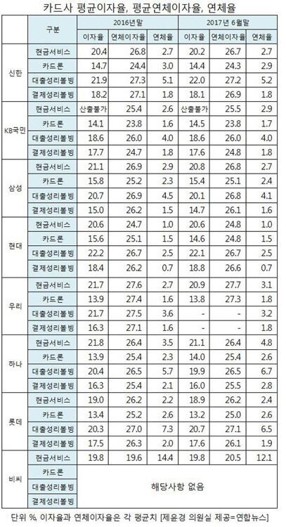 다른 카드사나 여타 대출 서비스에 적용된 평균 연체 이자율도 대부분 20%대 중반이다.