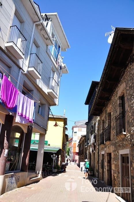 가사 그대로 푸른 벌판에 세워진 집이 너무나 멋드러져 보인다. 저런 집에서 살면 어떨까하는 생각이 스친다. 햇볕 아래 몽롱한 정신상태로 한 시간 넘게 걸어 비야프랑카 델 비에르소에 다다랐다. 마을 초입에 알베르게가 자리하고 있고 좀더 마을로 걸어내려가면 산띠아고 성당이 자리를 잡고 있다.이 성당에서는 병이 들거나 지쳐 순례를 할 수 없는 사람들에 한해서 산띠아고 데 콤포스텔라에서 받는 축복과 대사를 받을 수 있도록 해주었다고 한다. 바로 옆에 낡아 보이는 성당이 무척이나 독특함과 역사를 가지고 있으니 그냥 지나쳐 버리지 않았으면 한다.