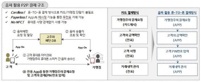 이 특허는 사람들이 들을 수 없는 영역의 음파(고주파)를 다양하게 패턴화하고, 이를 결제시마다 고객과 1대 1로 매칭해 휴대폰 스피커를 통해 송출하면 상대방 휴대폰 마이크를 통해 음파패턴을 입력 받아 결제하는 기술이다. 개별 고객간 매칭된 정보를 기반으로 상대방을 인식할 수 있기 때문에 별도의 보안 프로그램 및 결제용 단말기(POS 등) 설치 없이도 결제를 수행할 수 있어 편리성이 높다.