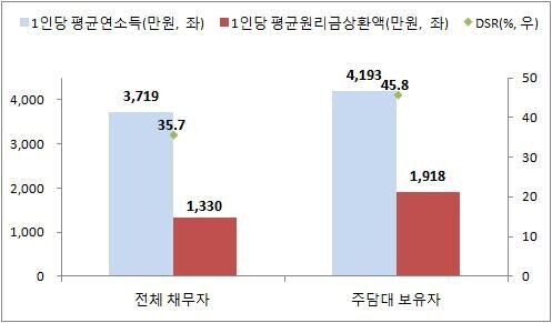 주택담보대출자는 전체 대출자와 비교해 평균소득이 4천193만원으로 많은 편이다. 연간 원리금 상환액은 1918만원으로 더 많다. 그래서 DSR가 45.8%로 10%포인트 높아진다.