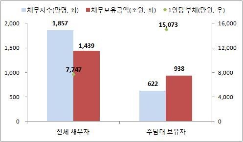 1857만명 가운데 자신의 집을 담보로 잡힌 대출자는 622만명으로, 전체 대출자의 3분의 1이다. 이들의 부채 총액은 938조원이다. 대부분 집을 살 때 낸 빚이다. 1인당 1억5073만원이다.