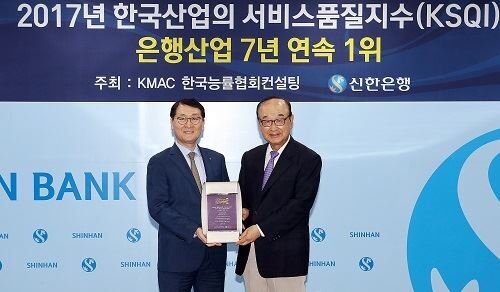 신한은행은 한국능률협회컨설팅(KMAC)이 주관하는 '2017 한국산업의 서비스품질지수(KSQI)' 고객접점부문에서 은행산업 7년 연속 1위 기업으로 선정되었다고 19일 밝혔다.