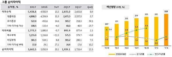 그룹 부문별 경영실적을 보면 상반기 순이자이익은 3조6655억원으로 전년동기대비 20.1%(6146억원) 늘어났다. 2분기 순이자이익은 1조9391억원으로 전분기대비 12.3%(2127억원) 증가했다. 상반기 순이자마진(NIM)은 1.98%로 전년동기대비 0.13$포인트(p) 증가했고, 2분기 NIM은 2.00%를 기록하며 전분기대비 0.05%p 늘어났다.