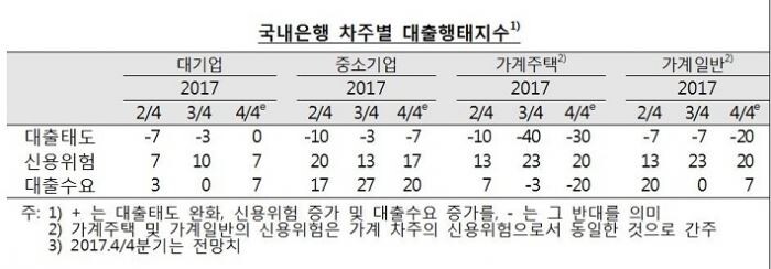 차주별 은행 대출태도지수 전망치를 보면 가계주택은 -30으로 3분기(-40)에 이어 큰 폭 마이너스를 나타냈다. 이는 글로벌 금융위기 전인 2007년 1분기에 -41을 기록한 바 있다.