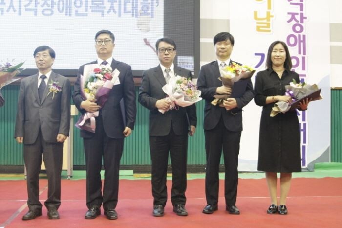 지난 17일 개최된 제38회 ‘흰지팡이의 날’ 기념식에서 '보건복지부장관상'을 수상했다. 사진은 수상 후 사진촬영을 하고 있는 조성진 CGV 전략기획담당(왼쪽 네번째). <사진=CGV>