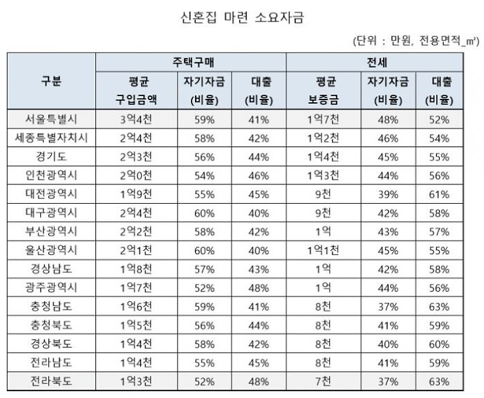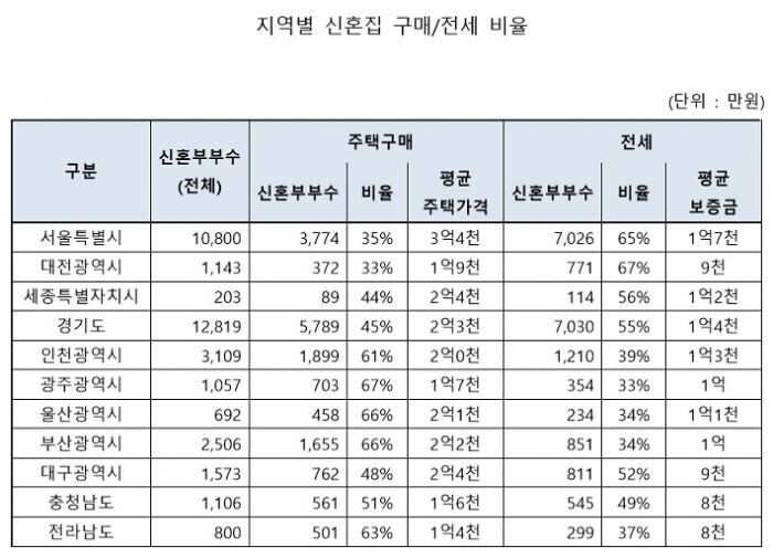 20일 KB국민은행에서 2016년도 신혼부부 대출현황에 대해 분석한 자료에 따르면 대한민국 신혼부부 중 52%는 전세로 신혼집을 구했으며 서울과 같은 주택가격이 높은 지역은 전국 평균대비 전세비율이 높은 것으로 나타났다. 반대로 광주광역시(67%), 울산·부산광역시(66%) 등 상대적으로 주택가격이 낮은 지역과 광역시의 신혼부부들은 구매비율이 높았다.