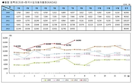 지난 6일 한국수입자동차협회(KAIDA)가 발표한 ‘2013년 7월 수입차 신규등록대수’ 자료에 따르면 지난 7월 등록한 수입차는 1만4953대로 전달에 비해 16.9% 증가했다. 이는 지난 5월 역대 최다 등록 기록(1만3411대)보다 1542대 늘어난 숫자다.