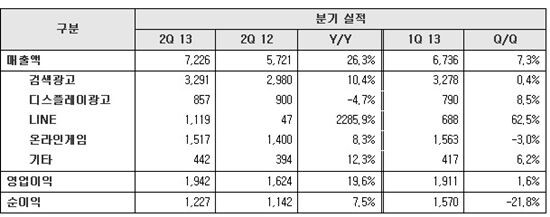 네이버와 NHN엔터테인먼트는 NHN이 2013년 2분기 매출액 7226억 원, 영업이익 1942억 원, 당기순이익 1227억 원의 실적을 달성했다고 8일 밝혔다.