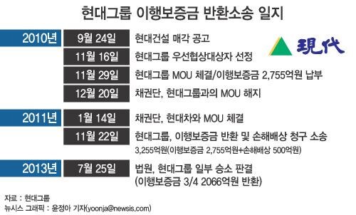 앞서 현대그룹은 지난 2010년 현대건설 인수전 당시 우선협상대상자로 선정돼 채권단 주관기관인 외환은행에 이행보증금 2755억원을 냈으나, 채권단이 인수자금 성격에 문제를 삼으면서 현대그룹의 우선협상대상자 지위를 박탈했다.