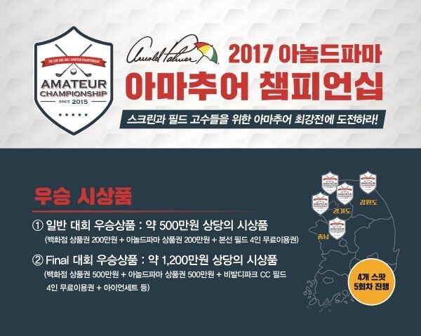 이번 ‘2017 아놀드파마와 함께하는 아마추어 챔피언십’은 스크린골프 및 필드골프 대회 합산 방식으로 일반 본선 4회, Final 대회 1회로 진행된다.
