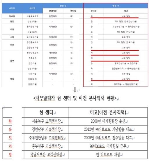 이와 관련, 민주당 을지로 위원회는 “실무차원에서 작성했다고 한 문건에 센터장의 내부 발탁과 전환배치가 명시돼 있다. 실제 문건과 똑같이 내부 발탁자들이 현재 센터장을 하고 있는 것으로 확인됐다”며 “본사 임원과 팀장들 상당수가 현재 고객·기술센터장을 하고 있다. 심지어 본사에서 센터장으로 갔다가 다시 본사로 이동한 사람도 있다”고 주장했다.