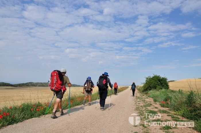 길을 걷다보면 무심코 우리는 앞만보고 걷는 성향을 보인다. 관성의 법칙처럼 그냥 앞만 보고 걷는다. 때로는 뒤돌아서서 걸어온 길을 되돌아보면 미쳐 보지 못했던 풍경과 마주할때도 있고, 얼마나 많이 걸어왔는지 되새길수도 있다. 그리고 줄지어 걸어오는 순례자들의 모습에 한없는 존경과 그 동반자가 많이 있음에 마음이 편해진다. 그리고 내가 제대로 걷고 있음에 안도하고 다시 앞으로 걸어 간다.