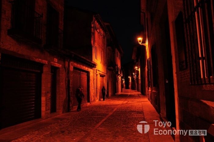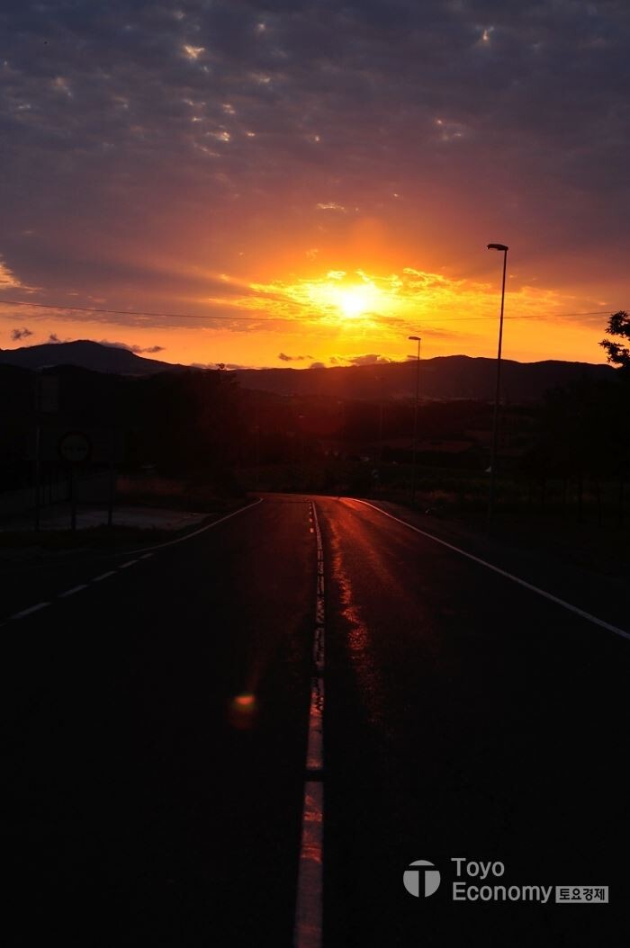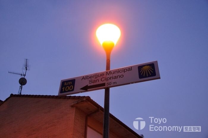 오늘도 6시가 조금 넘어서 알베르게를 나섰다. 시원한 공기를 마시면서 다니는것은 좋지만 사진을 찍으려는 나한테는 그닥 좋지 않은 상황이다.빛이 부족하여 사진으로 무엇인가 남기기에 좋은 조건이 아니기 때문이다. 삼각대마저 없으니 더욱 그렇다. 마을을 가로질러 도로변을 따라가다 표시를 잃어버려 조금 헤매기도 했다. 새벽이라도 완연하게 밝은 날이 아니기 때문에 자칫 노란색 화살표가 안보이는 경우가 발생하는데 오늘이 그런 날이다. 뒤돌아 내려가서 주변을 살펴본 후에야 횡단보도 건너편에서 노란색화살표를 다시 찾았다.