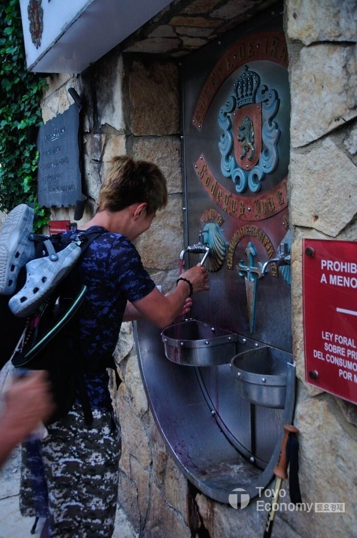 Monastery of Santa Maria de Irache 수도원 건너편 와이너리에서 제공하는 서비스인듯하다. 아침 9시부터 문을 연다는 얘기도 있었지만, 오전 7시 정도에 도착했을때에도 철문이 열려있었고 순례자들을 반겨주고 있었다. 수도꼭지가 2개이고 왼쪽에는 와인이, 오른쪽에는 물이 나온다. 그리고 맞은 편에는 자판기가 있는데 안주거리(?)와 생수를 판매하고 있었다. 순례자들이 신기한듯 너도나도 줄을 서서 한 모금씩 맛을 보고 있고 우리 일행도 기대감을 가지고 순서를 기다렸다.
