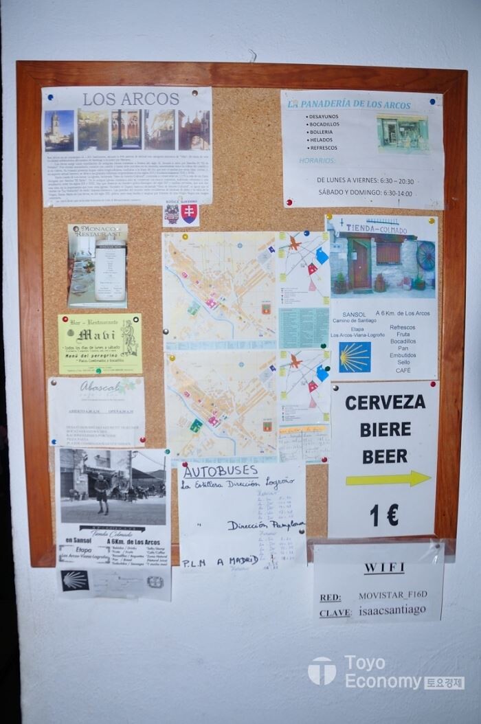공립알베르게던 사립알베르게던 입구 옆에 보면 안내판이 설치되어 있는데 이곳에 다양한 정보가 붙어 있다. 알베르게에서 제공하는 서비스종류(예를 들어 WiFi, 자판기, 맥주나 와인 판매여부), 트랜스퍼회사 안내, 주변 관광지 안내도, 지역에 운행하는 버스나 기차시간표, 주변추천식당 등 다양한 정보가 있다. 아무리 스페인어를 모른다 하더라도 영어와 비슷한 단어를 사용하는 경우가 많아 얼추 유추하여 정보를 찾아낼 수 있다. 그러니 그냥 지나치지 말고 찬찬히 보면 좋을 듯 싶다. 그리고 이런 안내판 주변에 기부또는 두고간 물품이나 책이 쌓여 있는 경우가 있는데 이들은 가져가도 되고 내가 내놓고 싶은 물건이 있으면 이곳에 두면 된다. 내가 필요없는 물품이라도 다른 순례자들에게는 도움이 될 수 있기 때문이다.