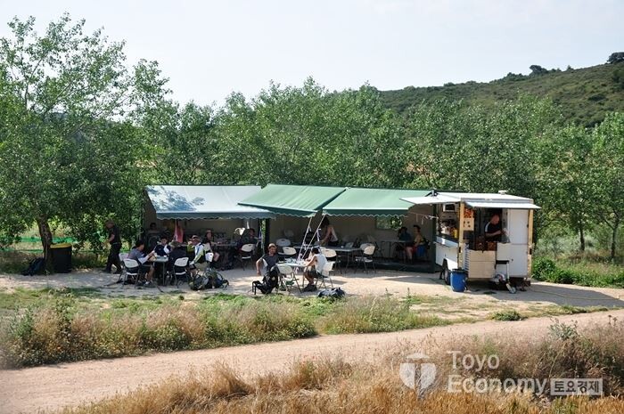 땡볕을 피할 수 있는 것은 나무그늘뿐이며, 이러한 길을 한 두 시간 걷다보면 지치게 마련이다. 그런데 마을이 없다는것은 쉬어갈만한 장소나 Bar같은 것이 없음을 나타내는데 어찌되었던 견디며 걸어야 했다. 가끔은 다행스럽게도 들판 한가운데 푸드트럭같은것이 존재할때도 있다. 그러면 순례자들은 약속이나 한것처럼 하나둘씩 그곳을 들렸고, 앞서간 순례자들은 뒷 사람들을 위해 자리를털고 의자를 비워준다.