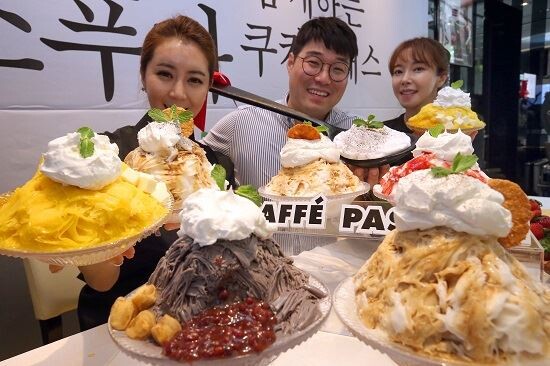 ▲ 이탈리아 커피전문점 파스쿠찌는 26일 강남구 압구정점에서 '오세득 셰프와 함께 하는 에스푸마(Espuma)쿠킹 클래스'를 진행했다. 오세득 세프와 모델들이 크림 형태로 부드러움을 강조한 프리미엄 아이스 디저트 '에스푸마 빙수'를 소개하고 있다. <사진=연합>