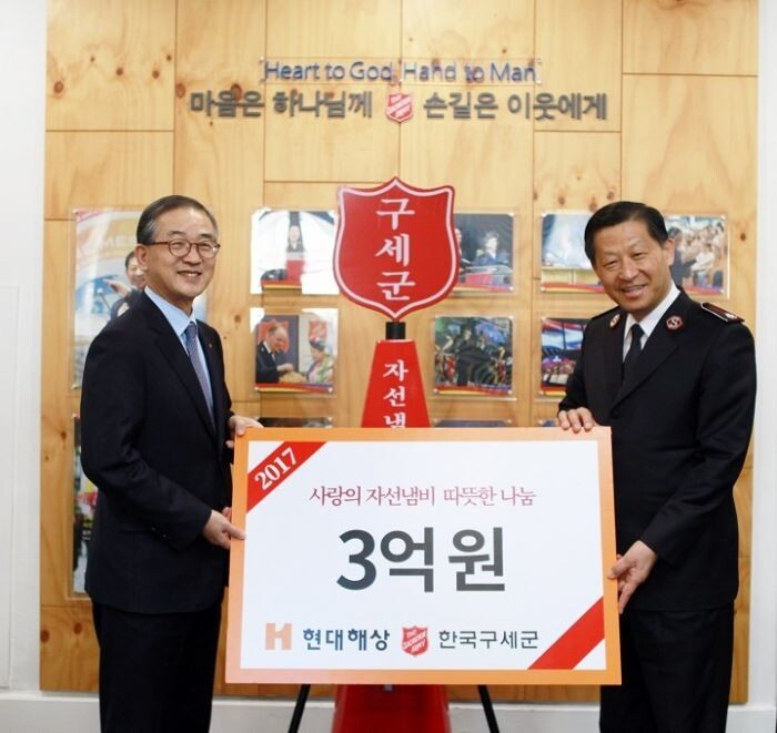 현대해상은 13일 서울 중구 정동에 위치한 구세군 중앙회관에서 구세군에 불우이웃돕기 성금 3억원을 전달했다. 이날 성금을 전달한 박찬종 현대해상 대표는 "매년 구세군의 의미 있는 활동에 현대해상이 함께 할 수 있어 기쁘다"며 "어려운 환경 속에서 추운 겨울을 보내고 있는 소외된 이웃들에게 잘 전달돼 의미있게 사용되기를 바란다"고 말했다.