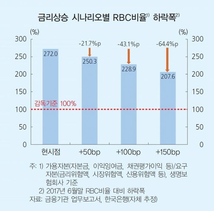 현재 생보사의 매도가능채권 규모는 지난 6월말 기준 213조7000억원에 달한다. 한은에 따르면 시장금리가 0.5%포인트 오르면 생보사의 평균 위험기준 자기자본비율(RBC비율)은 6월말 272%에서 21.7%포인트 하락하는 것으로 추정됐다.