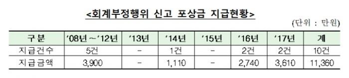 [토요경제=정종진 기자] 올해 상장사 회계부정행위 신고자에게 3610만원의 포상금이 지급된 것으로 나타났다.