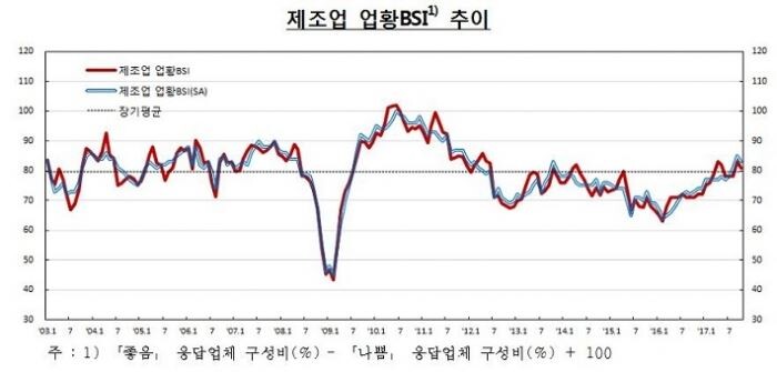 BSI는 기업이 인식하는 경기 상황을 나타낸 지표로 기준치인 100 이상이면 경기를 좋게 보는 기업이 그렇지 않은 기업보다 많다는 뜻이다.