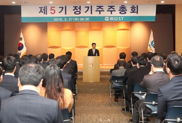 ▲ 강수형 동아에스티 부회장이 27일 열린 제5기 정기주총에서 인사말을 하고 있다. <사진=동아에스티>