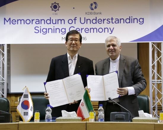 3일 은행권에 따르면 이동걸 KDB산업은행 회장은 박근혜 대통령의 이란 순방 경제사절단 일원으로 참가해 이란중앙은행과 대표적인 상업은행인 멜랏은행(Bank Mellat)과 업무협약을 체결했다.