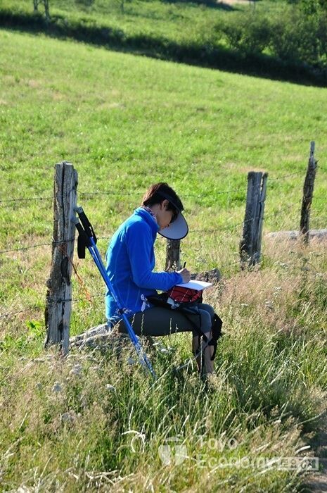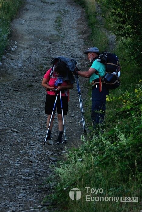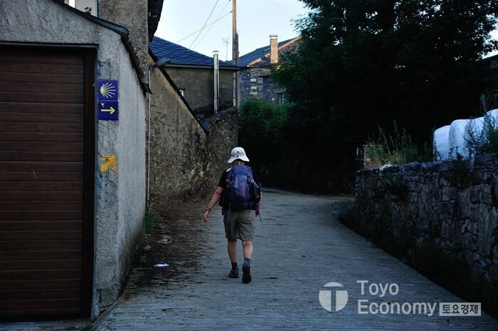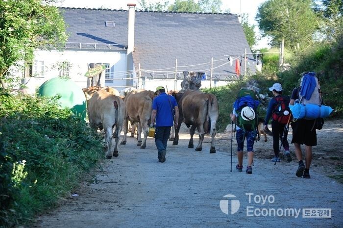 Triacastela까지 가는 길은 좁은 오솔길과 시골마을길이다. 메세타 평원을 지날때 느꼈던 확트인 벌판에 너른 길이 아니라 오밀조밀 산을 둘러 마을을 가로지르는 길이다. 그러다 보니 어느 지역보다 훨씬 시골스러운 분위기속을 걷는다. 이런 모습이 갈리시아 구간의 특징이다. 이전에는 볼 수 없었던 독특한 건물도 여기서는 만날 수 있다. 오레오같은 헛간 건물, 옛 켈트인이 주거지로 사용하고 스페인에서 오래된 건물 양식인 빠요사를 볼 수 있는 것도 여기이다. 게다가 이른 아침 마을을 가로질러 갈때는 소몰이하는 모습도 심심치 않게 만나다. 모두가 목가적인 시골 풍경이다. 이런 풍경을 대하는 일행들의 모습도 달랐다. 나와 테스님은 신기한듯 천천히 사진을 찍으며 가는 반면에 쪼리신은 앞서 걷기 바쁘다. 아마도 걷는 속도가 느리다고 계속 나아가려는 성향이 보였다. 바다바람님도 홀로 조용히 우리보다 조금 앞서서 걷고 있다. 가끔 뒤돌아 보면 우리를 기다린다.