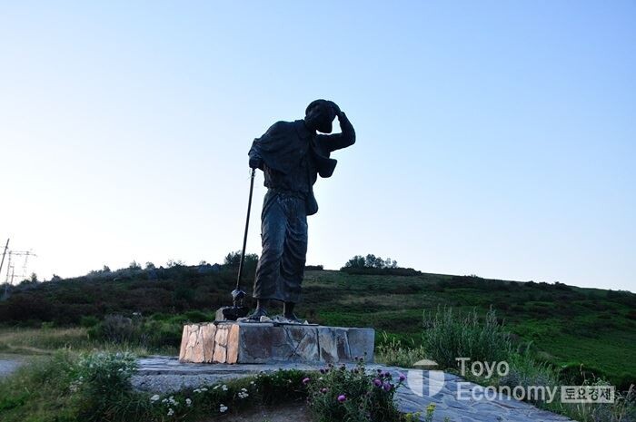 언덕에 올라 뒤돌아 보니 해가 떠오르고 있었다. 그리고 추위도 조금 누그러졌고, 도로 건너편에 모자를 눌러쓰고 걷는 순례자 동상이 눈에 들어왔다. 저 동상의 모습이 전혀 어색하지 않았다. 지금까지 저런 모습을 하며 걸어왔던 적이 있기 때문이다. 동질감을 느끼는 동상이라니...
