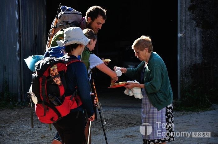 Triacastela까지는 꾸준한 내리막길이다. 작은 시골 마을을 계속 거쳐 간다. 그때마다 소떼를 이끌고 소몰이 나오는 풍경을 자주 마주한다. 사람보다 개 한 마리가 많은 소떼를 이끄는 모습은 꽤나 인상적이다. 게다가 지나가는 순례자들에게 먹을 물이나 간식을 주는 할머니들도 간혹 보인다. 무엇을 바라는것은 아닐텐데 선의를 베푸는 시골분들의 인심이 너무나 고맙게 보였다. 하지만 나는 받아 먹지 못했다. 그저 멀뚱히 바라볼 뿐 이다. 그자리에 끼어들기 애매하다는 이유로...