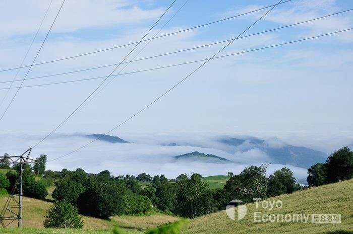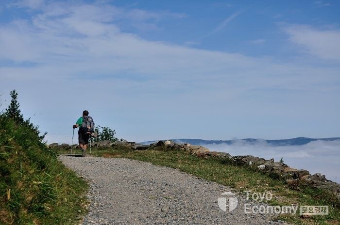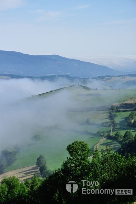이른 아침에 시작하는 순례길은 좋은 점과 나쁜 점이 명확했다. 이른 아침에 걸으면 많은 순례자들을 만난다. 그리고 알베르게를 여유롭게 선점할 수 있다는 점이다. 게다가 아침에만 볼 수 있는 일출, 소몰이, 안개나 운무가득한 풍경들을 만날 수 있다는 점이다. 반대로 사진을 찍는 나에게는 어두운 아침은 좋지가 않다. 의외로 놓치는 풍경이 꽤 된다. 게다가 오후에 도착해도 길에서 만나는 매직아워의 시간을 만날 수 없다. 사진이 단조로워 진다는 점이다. 그래도 푸른 하늘과 산 아래 운무 가득한 풍경을 만나는 것으로 만족해야 했다. 오후가 되면 날아가 버릴 구름이기에...