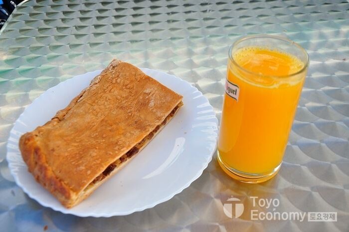 이른 아침부터 나온지라 Bar를 찾아 아침식사를 해결해야했다. 북쪽길 갔을때는 전날 슈퍼마켓에 들려 저녁과 아침식사 거리를 준비하여 배낭에 넣고 다녔는데 이번에는 그렇게 할 수 없었다. 혼자 하기에도 일행들이 신경쓰이기 때문이다. 그저 물병에 물만 채우고 마리아비스켓만 비상용으로 들고 다닐 뿐이다. 엘 아세보에서 맛있게 먹었던 고기파이가 생각나 처음 보이는 Bar에서도 파이를 주문했다. 하지만 그 맛이 아니다. 딱딱하고 식어있어 먹기 불편했다. 내 이빨이 부러질것 같은 기분이다. 오래도록 씹고씹어 먹어야 했다. 배고프니 버릴 수도 없다. 적게 먹어도 덜 부담스러운 것은 오르막길이 아니라 계속 이어지는 내리막길이라는 점이다. 중력에 이끌려 힘 안들이고 걷는 방향이다.