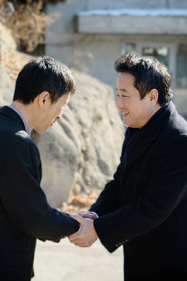 ▲ 이웅열 코오롱그룹 회장(오른쪽)이 작년 12월26일 故 이동찬 코오롱 명예회장 49재가 진행된 서울 성북구 길상사를 찾은 정리해고자 대표 최일배 씨와 악수를 나누고 있다. 이후 코오롱그룹의 주력 계열사인 코오롱인더스트리는 노사 상생과 노사 문화발전을 위한 소정의 금액을 제3의 기관에 기부하기로 결정했다고 밝혔다.