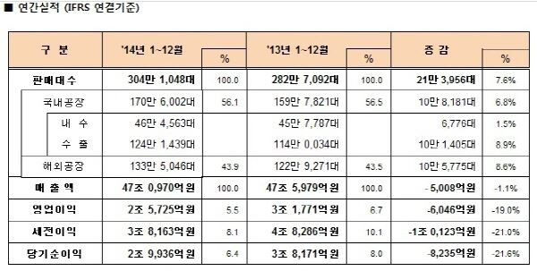 매출액은 글로벌 판매 증대와 내수 2.1%·수출 2.5% 등 판매단가 상승에도 불구, 원화강세에 따른 실적기준 환율이 3.7% 하락해 전년대비 1.1% 감소한 47조970억원을 달성했다. 매출액 대비 판매관리비 비율은 브랜드 인지도 향상과 상품성 강화로 판촉비 집행의 효율성이 높아지고, 전사적 비용절감 노력을 통해 전년보다 0.1%P 내려간 14.4%를 나타냈다.