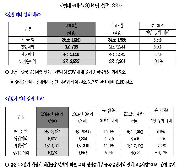 이와 관련 현대모비스는 23일 2014년 경영실적 잠정치를 발표해 매출액과 영업이익 모두 글로벌 금융위기가 시작된 2007년이후 7년 연속 안정적인 증가세를 기록하고 있다고 밝혔다.